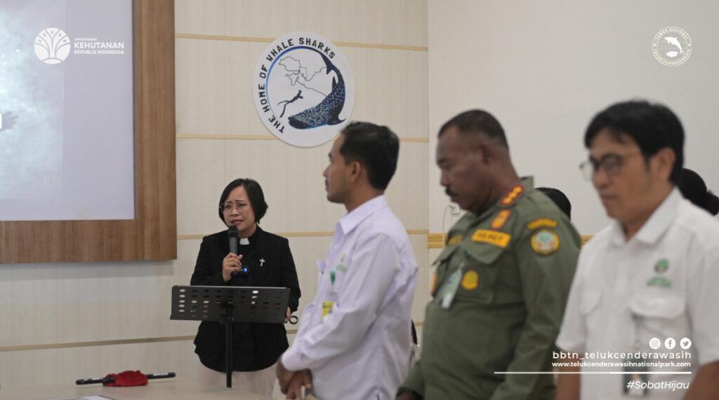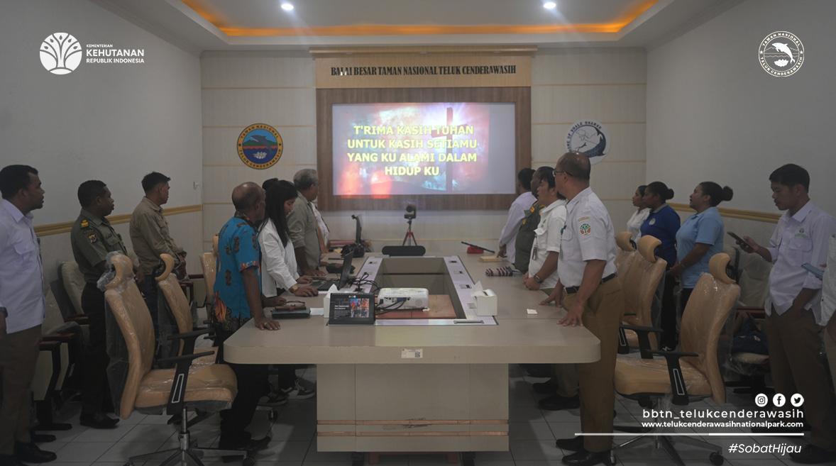 Pimpinan dan staf Balai Besar Taman Nasional Teluk Cenderawasih menggelar Ibadah Pengucapan Syukur atas pelaksanaan Tahun Kerja 2025, sekaligus memohon berkat dan penyertaan Tuhan dalam memasuki Tahun Kerja 2026, Selasa, 13/1/2026, bertempat di ruang rapat Balai Besar Taman Nasional Teluk Cenderawasih.
